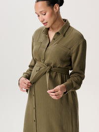Einfarbiges Umstandskleid aus weichem Musselin. Das knielange Kleid hat einen Kragen, eine durchgehende Knopfleiste vorne, zwei aufgesetzte Brusttaschen, lange Ärmel mit Manschetten und wird mit einem passenden Gürtel geliefert.
