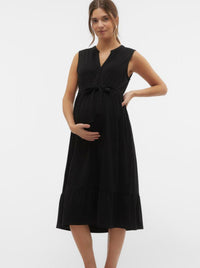 Essential für die gesamte Schwangerschaft: das Mamalicious Midi Umstandskleid ohne Ärmel mit schwingendem Volantsaum. Aus recyceltem Polyester und Viskose gefertigt, fällt das Schwangerschaftskleid bequem und leicht über deinen Babybauch. Ärmellos ist das Kleid auch für warme Tage geeignet. Die Knopfleiste vorne ermöglicht in der Stillzeit einen diskreten Zugang zur Brust. Kommt mit Stehkragen, V-Ausschnitt und abnehmbarem Taillenband. Style dazu etwa Sandalen an warmen oder Boots und Cardigan an kühleren Tagen.