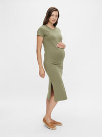 Schlichtes Design in angesagtem oliv für die warmen Tage. Dieses T-Shirt-Umstandskleid ist nicht nur super bequem, sondern zeigt den wachsenden Babybauch perfekt. Es hat einen runden Halsausschnitt und zwei Schlitze an der Seite. Die Midi-Länge passt perfekt zu Sneakern oder Sandalen.