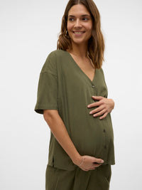 Lässige Umstands- und Stillbluse von Vero Moda Maternity in Grün - mit viel Platz für deinen wachsenden Babybauch. Der Viskose-Leinen Mix ist leicht und angenehm zu tragen. Durch die Knopfleiste vorne kannst du auch nach der Schwangerschaft schnell und unkompliziert Stillen. Kombiniere die Bluse mit einer Jeans oder einer Stoffhose für einen entspannten Look.