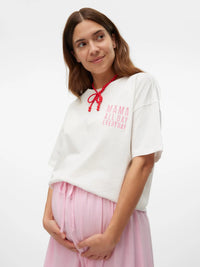 Lässiges Umstandsshirt von Mamalicious mit kurzem Arm und Rundhalsausschnitt. Die rosa Stickerei ist ein besonderer Hingucker. Das Umstandsshirt ist oversized geschnitten für mehr Flexibilität mit wachsendem Babybauch. Kombiniere dazu eine Umstandsjeans und Sneaker oder trage es mit buntem Maxirock.