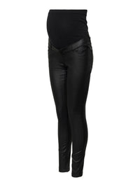 Im klassischen 5-Pocket-Look: die Vero Moda Maternity Skinny Umstandsjeans in schwarz mit Leder-Coating, elastischem Bund und verstellbarem Gummiband unterhalb des Babybauchs. Kombiniere die stylische Umstandshose mit weiten Umstandspullovern und Oversize Shirts.