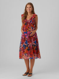 Zeigt sich sommerlich luftig mit großformatigem Blumenprint auf leichtem recyceltem Polyester: das midilange Mamalicious V-Neck-Schwangerschaftskleid mit Volantträgern, Rückenschnürung und Cut-out hinten mit Smokdetail, das für eine angenehme Passform im Brustbereich sorgt. Ein feminines Highlight für die nächste Sommerparty! Style es etwa als Abendkleid mit flachen Heels oder als Sommerkleid mit Sandalen.