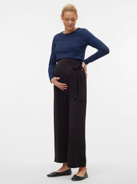 Weiche Umstandshose von Mamalicious mit weitem Bein und Bindegürtel, der seitlich über dem Bauch gebunden wird. Das Material ist besonders angenehm und fließend.
